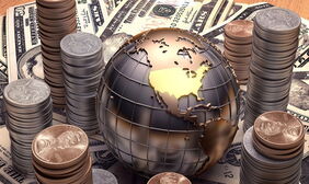 硬币美元地球仪PPT背景图片