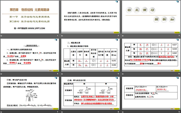 [提示] 碱金属原子结构存在递变性。从Li到Cs,随核电荷数的增加,电子层数逐渐增多,原子半径逐渐增大,原子核对最外层电子的引力逐渐减弱,元素金属性逐渐增强;故单质的还原性逐渐增强,离子的氧化性逐渐减弱。