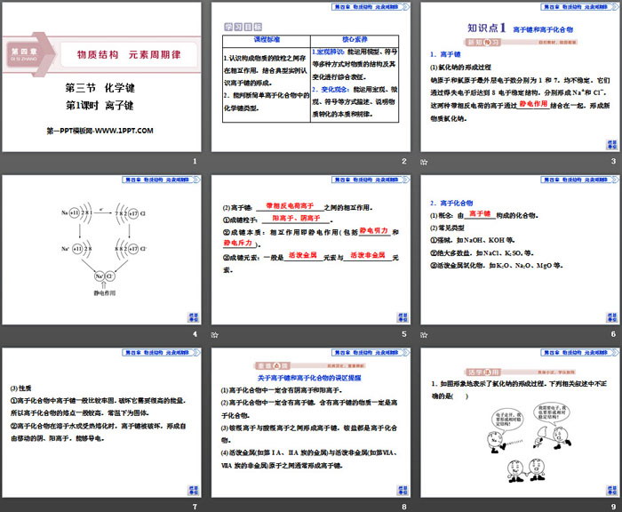 关键词:人教版高中化学必修一PPT课件免费下载,化学键PPT下载,物质结构元素周期律PPT下载,离子键PPT下载,.PPT格式;