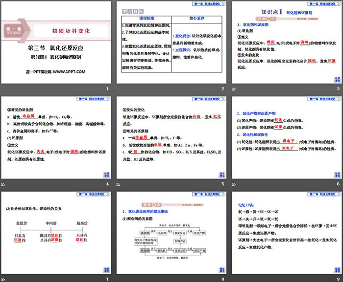 关键词:人教版高中化学必修一PPT课件免费下载,氧化还原反应PPT下载,物质及其变化PPT下载,氧化剂和还原剂PPT下载,.PPT格式;