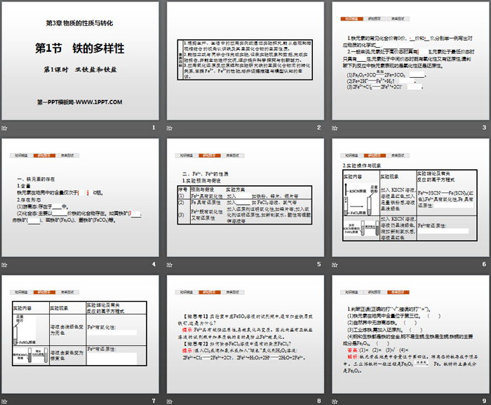 关键词:鲁科版高中化学必修一PPT课件免费下载,铁的多样性PPT下载,物质的性质与转化PPT下载,亚铁盐和铁盐PPT下载,.PPT格式;