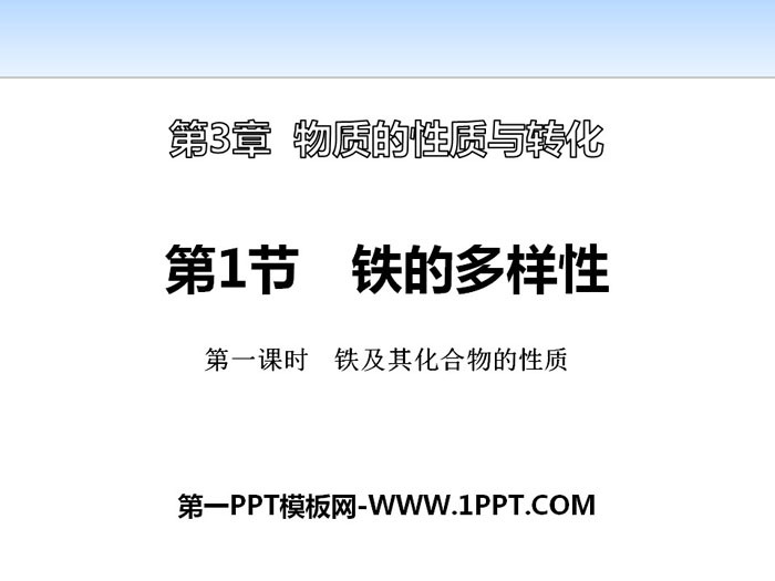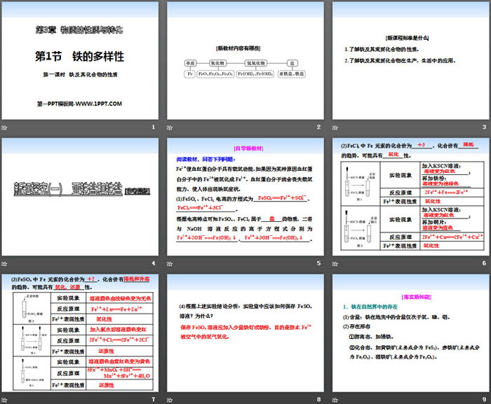 关键词:鲁科版高中化学必修一PPT课件免费下载,铁的多样性PPT下载,物质的性质与转化PPT下载,铁及其化合物的性质PPT下载,.PPT格式;