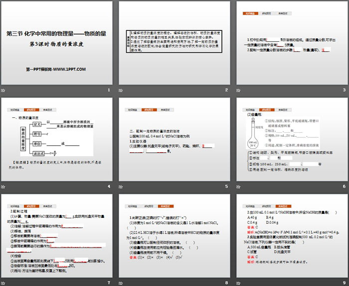 2.通过了解容量瓶的主要用途和使用方法;了解一定物质的量浓度溶液的配制,体会定量研究的方法对研究和学习化学的重要作用。