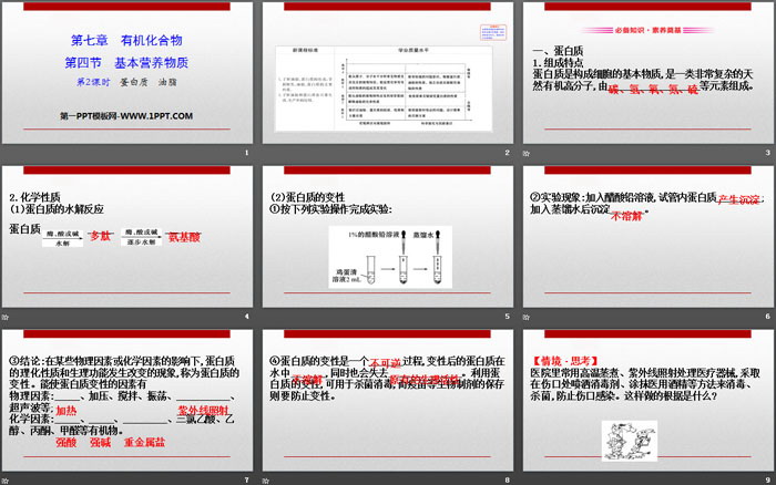 关键词:人教版高中化学必修二PPT课件免费下载,基本营养物质PPT下载,有机化合物PPT下载,蛋白质油脂PPT下载,.PPT格式;