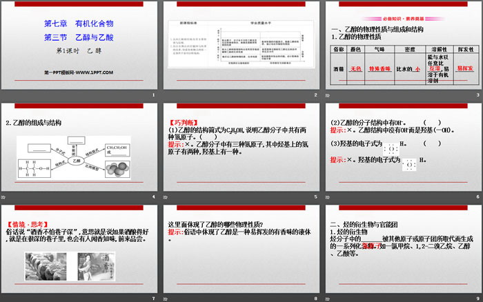 关键词:人教版高中化学必修二PPT课件免费下载,乙醇与乙酸PPT下载,有机化合物PPT下载,乙醇PPT下载,.PPT格式;