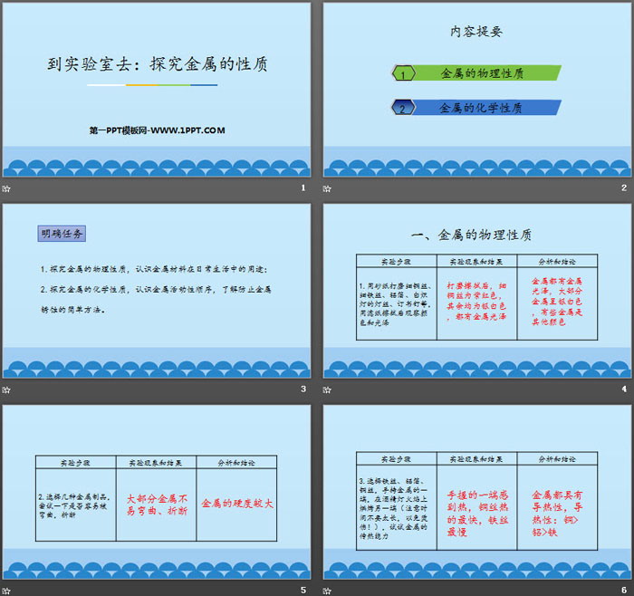 1.探究金属的物理性质,认识金属材料在日常生活中的用途;
