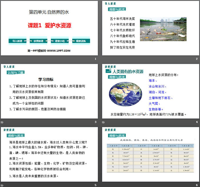 1.了解地球上水的存在和分布情况;知道人类可直接利用的淡水资源极其有限