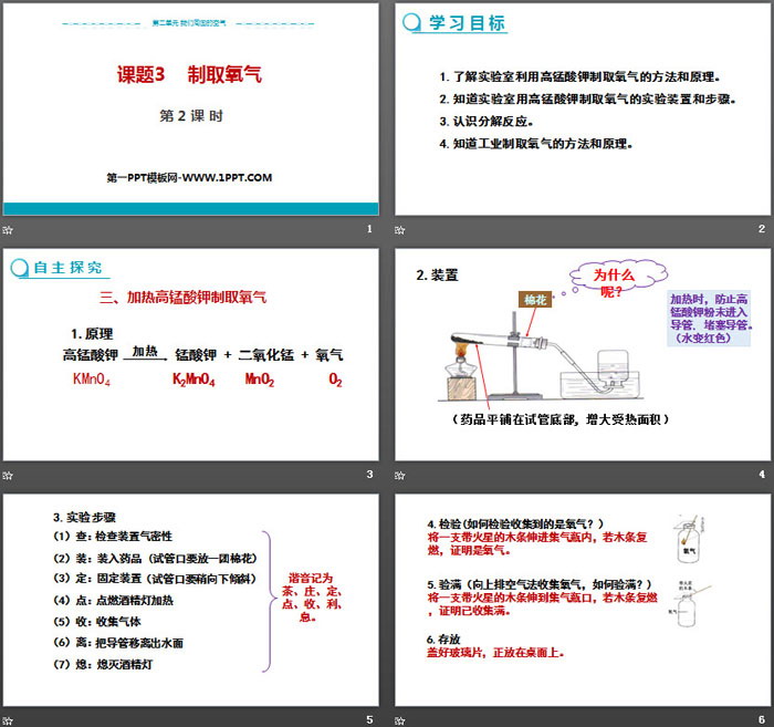 1.了解实验室利用高锰酸钾制取氧气的方法和原理。