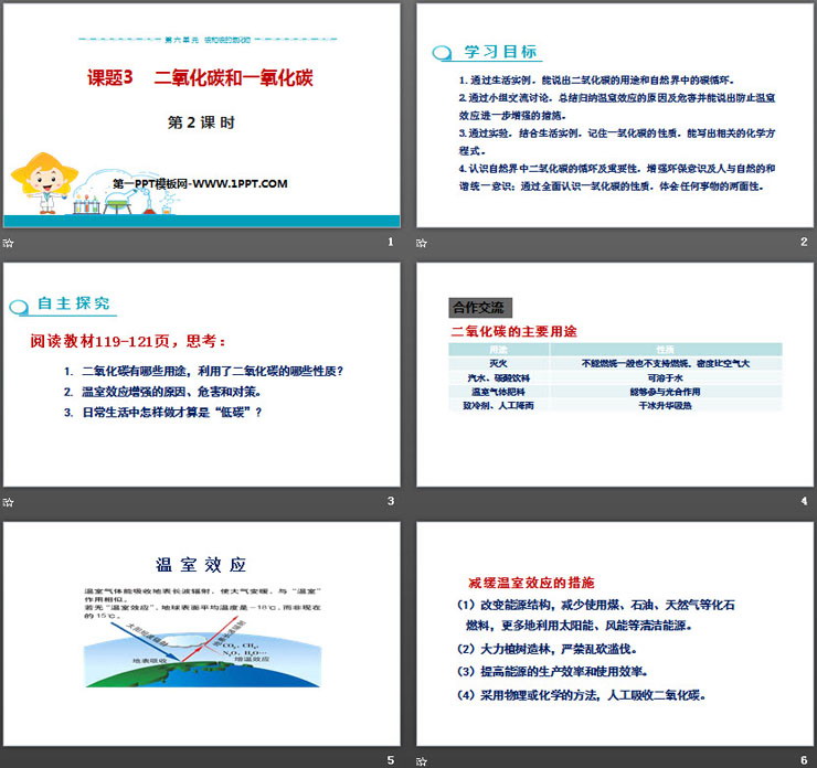 4.认识自然界中二氧化碳的循环及重要性,增强环保意识及人与自然的和谐统一意识;通过全面认识一氧化碳的性质,体会任何事物的两面性。