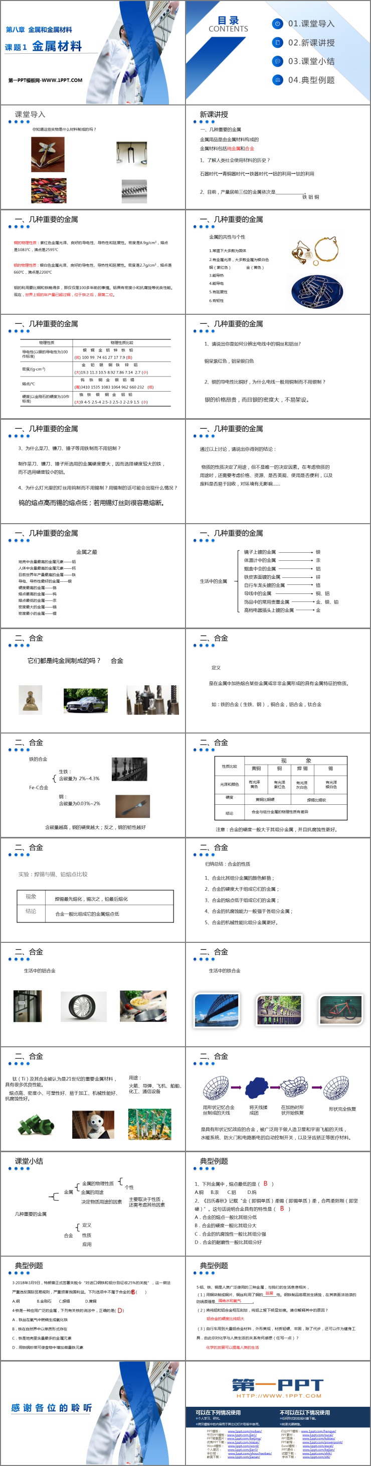 《金属材料》PPT精品课件包含课堂导入、新课讲授、课堂小结、典型例题等内容。