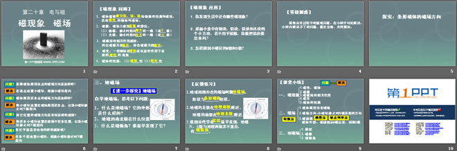 关键词:电与磁教学课件,磁现象磁场教学课件,新人教版九年级全一册物理PPT课件,九年级物理幻灯片课件下载,电与磁PPT课件下载,磁现象磁场PPT课件下载,.ppt格式