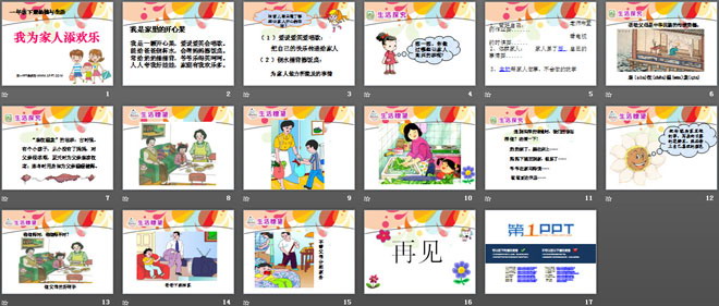 关键词:我的家人和伙伴教学课件,我为家人添欢乐教学课件,新人教版一年级下册品德与生活PPT课件,一年级品德与生活幻灯片课件下载,我的家人和伙伴PPT课件下载,我为家人添欢乐PPT课件下载,.ppt格式