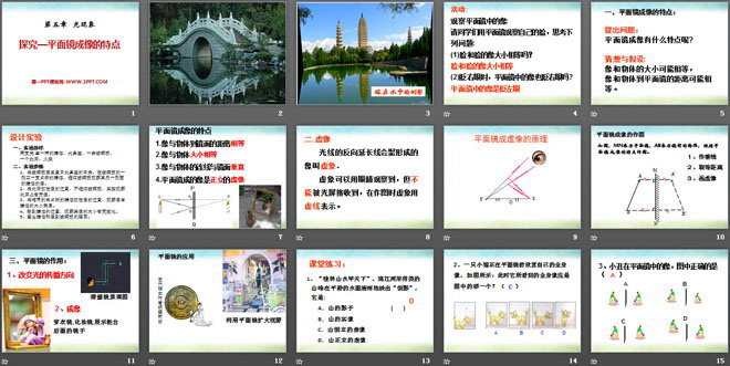 1、平面镜成像的特点是:物体在平面镜里成的像是_____像,像和物的大小_____,它们的连线跟镜面_____,它们到镜面的距离_____。