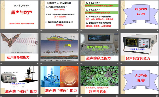 关键词:声的世界教学课件,超声与次声教学课件,沪科版八年级全册物理PPT课件下载,八年级物理幻灯片课件下载,声的世界PPT课件下载,超声与次声PPT课件下载,.PPT格式;