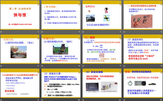 关键词:运动的世界教学课件,快与慢教学课件,沪科版八年级全册物理PPT课件下载,八年级物理幻灯片课件下载,运动的世界PPT课件下载,快与慢PPT课件下载,.PPT格式;
