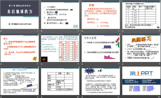 关键词:熟悉而陌生的力教学课件,来自地球的力教学课件,沪科版八年级全册物理PPT课件下载,八年级物理幻灯片课件下载,熟悉而陌生的力PPT课件下载,来自地球的力PPT课件下载,.PPT格式;