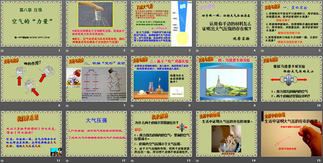 关键词:压强教学课件,空气的力量教学课件,沪科版八年级全册物理PPT课件下载,八年级物理幻灯片课件下载,压强PPT课件下载,空气的力量PPT课件下载,.PPT格式;