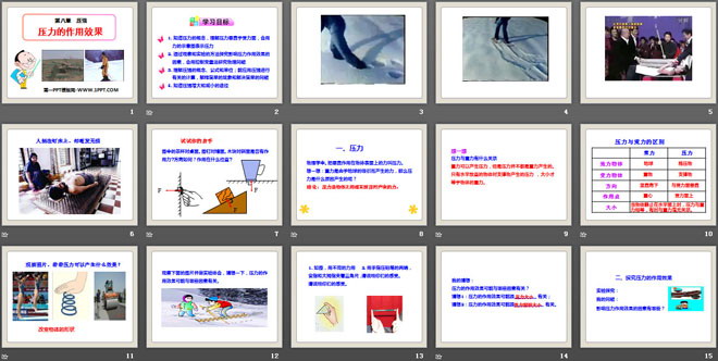 关键词:压强教学课件,压力的作用效果教学课件,沪科版八年级全册物理PPT课件下载,八年级物理幻灯片课件下载,压强PPT课件下载,压力的作用效果PPT课件下载,.PPT格式;