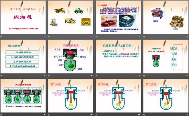 关键词:内能与热机教学课件,内燃机教学课件,沪科版九年级全册物理PPT课件下载,九年级物理幻灯片课件下载,内能与热机PPT课件下载,内燃机PPT课件下载,.PPT格式;