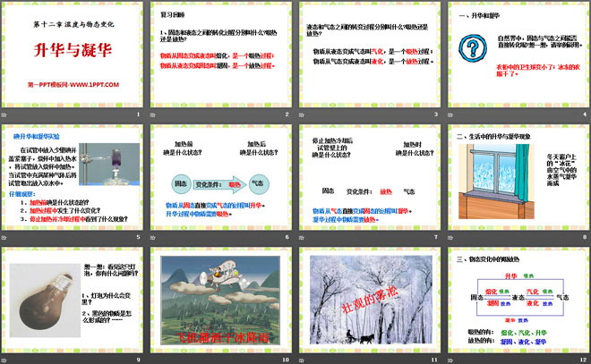 关键词:温度与物态变化教学课件,升华与凝华教学课件,沪科版九年级全册物理PPT课件下载,九年级物理幻灯片课件下载,温度与物态变化PPT课件下载,升华与凝华PPT课件下载,.PPT格式;