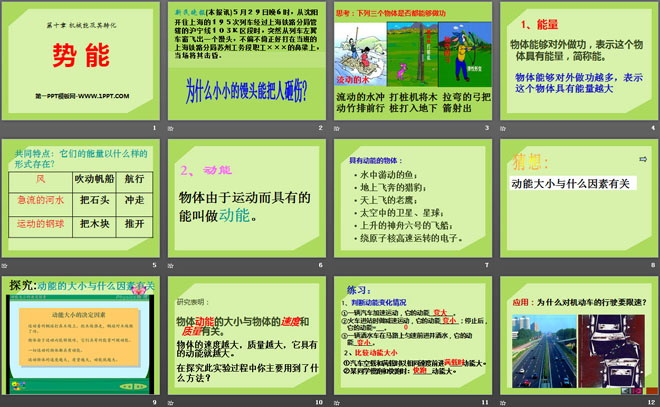 关键词:机械能及其转化教学课件,势能教学课件,鲁教版八年级下册物理PPT课件下载,八年级物理幻灯片课件下载,机械能及其转化PPT课件下载,势能PPT课件下载,.PPT格式;