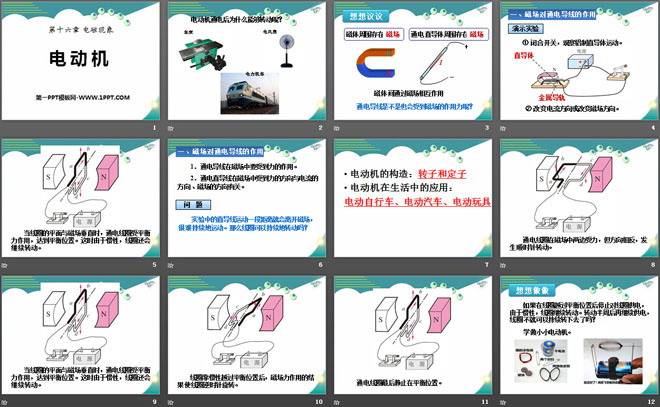 关键词:电磁现象教学课件,电动机教学课件,鲁教版九年级下册物理PPT课件下载,九年级物理幻灯片课件下载,电磁现象PPT课件下载,电动机PPT课件下载,.PPT格式;