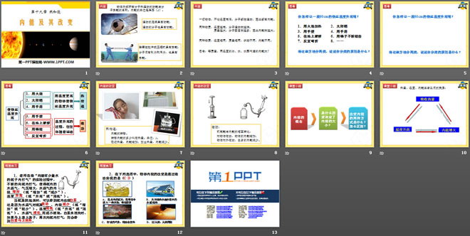 关键词:热和能教学课件,内能及其改变教学课件,鲁教版九年级下册物理PPT课件下载,九年级物理幻灯片课件下载,热和能PPT课件下载,内能及其改变PPT课件下载,.PPT格式;