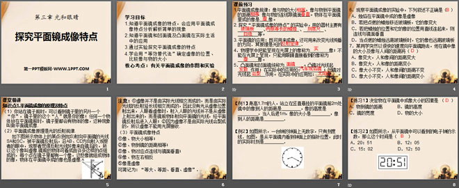 1.知道平面镜成像的特点,会应用平面镜成像特点分析解析简单的现象