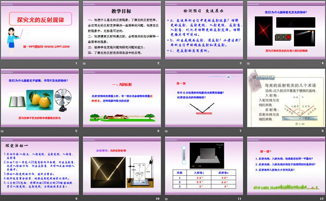 关键词:光和眼睛教学课件,探究光的反射定律教学课件,粤沪版八年级上册物理PPT课件下载,八年级物理幻灯片课件下载,光和眼睛PPT课件下载,探究光的反射定律PPT课件下载,.PPT格式;
