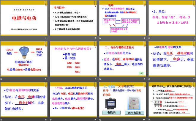 关键词:电能与电功率教学课件,电能与电功教学课件,粤沪版九年级上册物理PPT课件下载,九年级物理幻灯片课件下载,电能与电功率PPT课件下载,电能与电功PPT课件下载,.PPT格式;