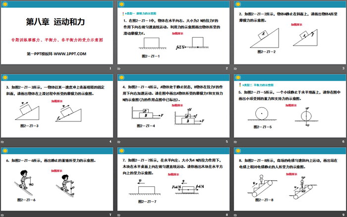 关键词:人教版八年级物理下册PPT课件免费下载,摩擦力平衡力非平衡力的受力示意图PPT下载,运动和力PPT下载,.PPT格式;