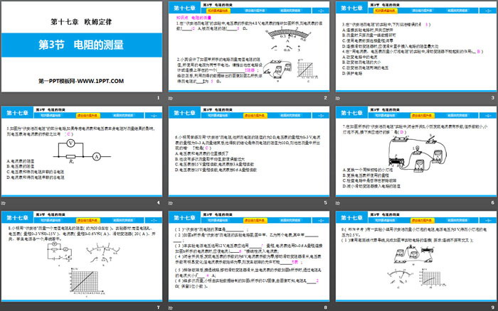 关键词:人教版九年级物理全一册PPT课件免费下载,电阻的测量PPT下载,欧姆定律PPT下载,.PPT格式;