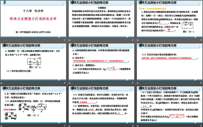 关键词:人教版九年级物理全一册PPT课件免费下载,特殊方法测量小灯泡的电功率PPT下载,电功率PPT下载,.PPT格式;