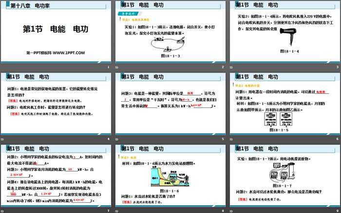 关键词:人教版九年级物理全一册PPT课件免费下载,电能电功PPT下载,电功率PPT下载,.PPT格式;