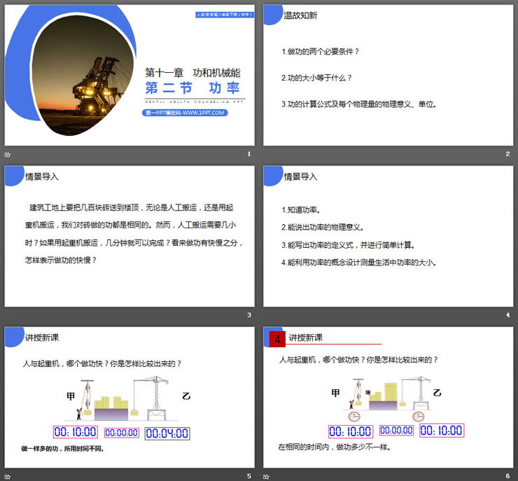 建筑工地上要把几百块砖送到楼顶,无论是人工搬运,还是用起重机搬运,我们对砖做的功都是相同的。然而,人工搬运需要几小时?如果用起重机搬运,几分钟就可以完成?看来做功有快慢之分,怎样表示做功的快慢?