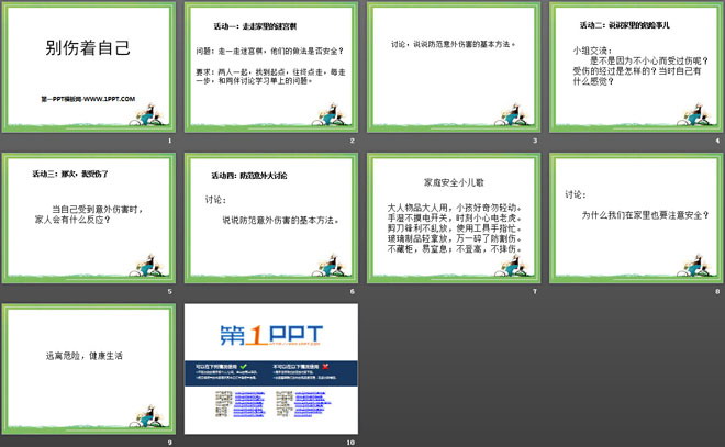 关键词:人教版一年级上册道德与法治PPT课件免费下载,别伤着自己PPT下载,家中的安全与健康PPT下载,.PPT格式;