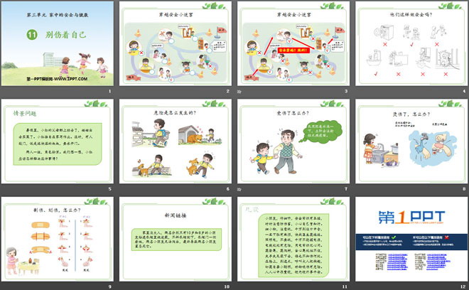 关键词:人教版一年级上册道德与法治PPT课件免费下载,别伤着自己PPT下载,家中的安全与健康PPT下载,.PPT格式;