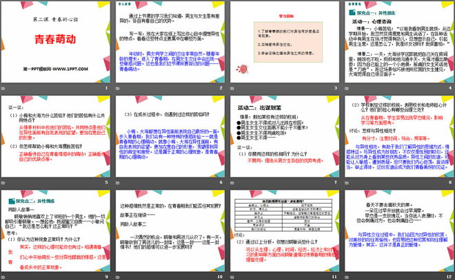 关键词:人教版七年级下册道德与法治PPT课件免费下载,青春萌动PPT下载,青春的心弦PPT下载,.PPT格式;