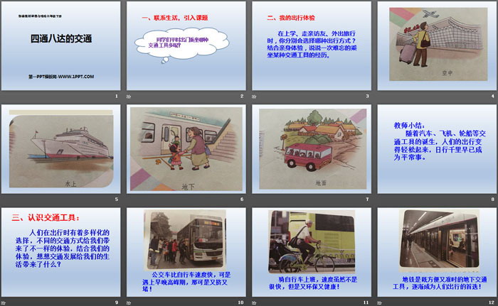 关键词:人教版三年级下册道德与法治PPT课件免费下载,四通八达的交通PPT下载,多样的交通和通信PPT下载,.PPT格式;