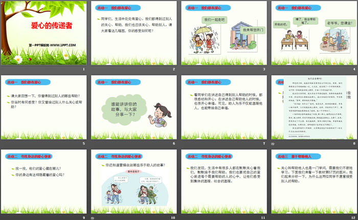 同学们,生活中处处有爱心。我们都得到过别人的关心、帮助,我们也应该关心、帮助别人。请大家看这几幅图,你的感受如何呢?