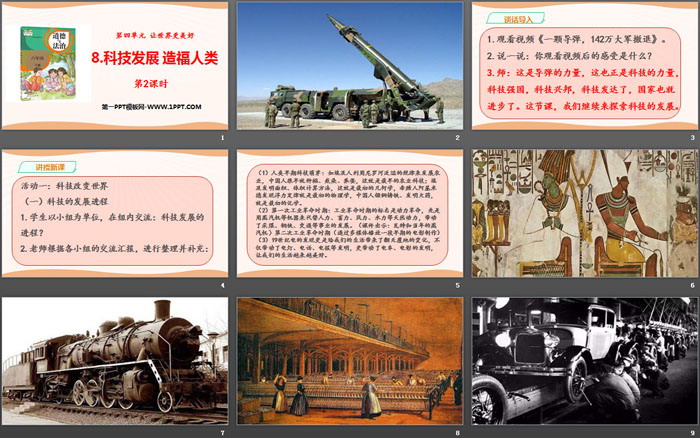 3.师:这是导弹的力量,这也正是科技的力量,科技强国,科技兴邦,科技发达了,国家也就进步了。这节课,我们继续来探索科技的发展。