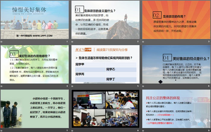 关键词:人教版七年级下册道德与法治PPT课件免费下载,憧憬美好集体PPT下载,.PPT格式;