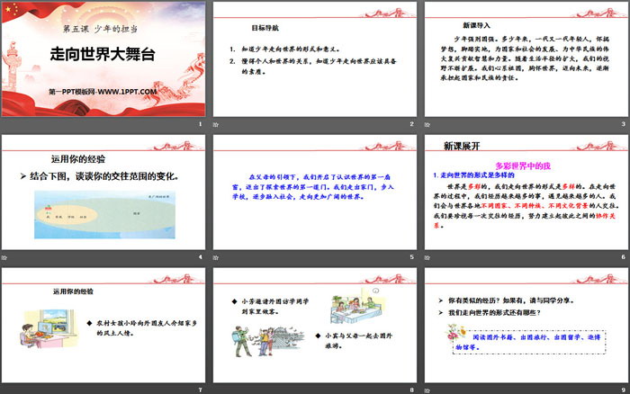 关键词:人教版九年级下册道德与法治PPT课件免费下载,走向世界大舞台PPT下载,少年的担当PPT下载,.PPT格式;