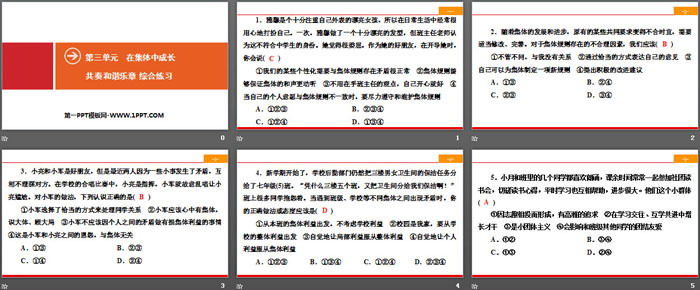 关键词:人教版七年级下册道德与法治PPT课件免费下载,共奏和谐乐章PPT下载,在集体中成长PPT下载,综合练习PPT下载,.PPT格式;