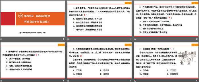 关键词:人教版八年级下册道德与法治PPT课件免费下载,尊重自由平等PPT下载,崇尚法治精神PPT下载,综合练习PPT下载,.PPT格式;