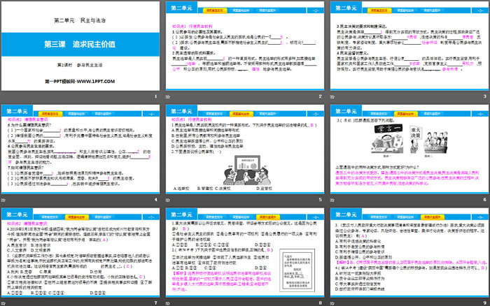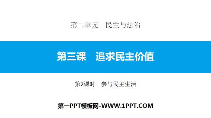 关键词:人教版九年级上册道德与法治PPT课件免费下载,追求民主价值PPT下载,民主与法治PPT下载,参与民主生活PPT下载,.PPT格式;