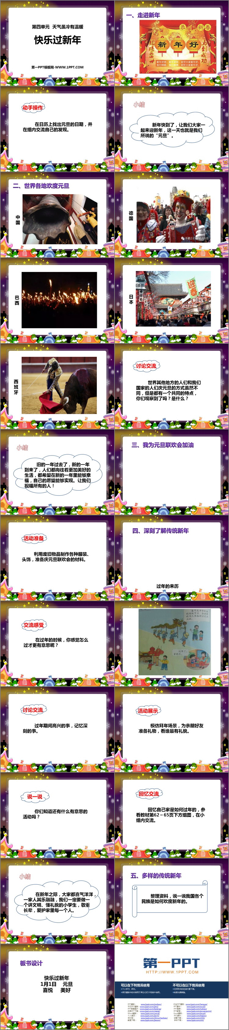 《快乐过新年》PPT课件包含走进新年、世界各地欢度元旦、我为元旦联欢会加油、深刻了解传统新年、多样的传统新年等内容。