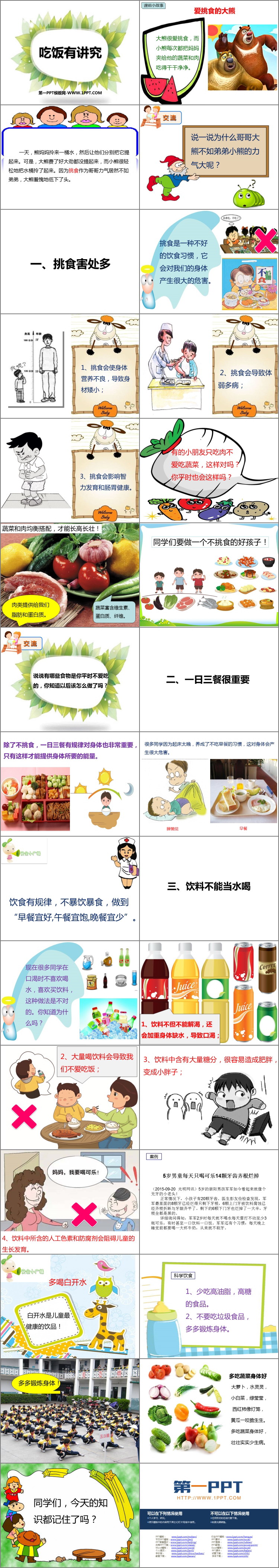 《吃饭有讲究》PPT课件包含课前小故事、挑食害处多、一日三餐很重要、饮料不能当水喝、 科学饮食等内容。