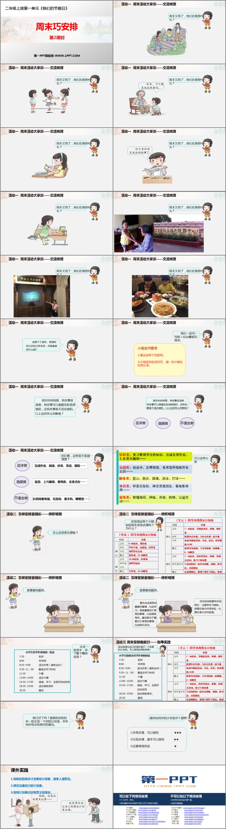 《周末巧安排》PPT课件包含课堂活动、课外实践等内容。