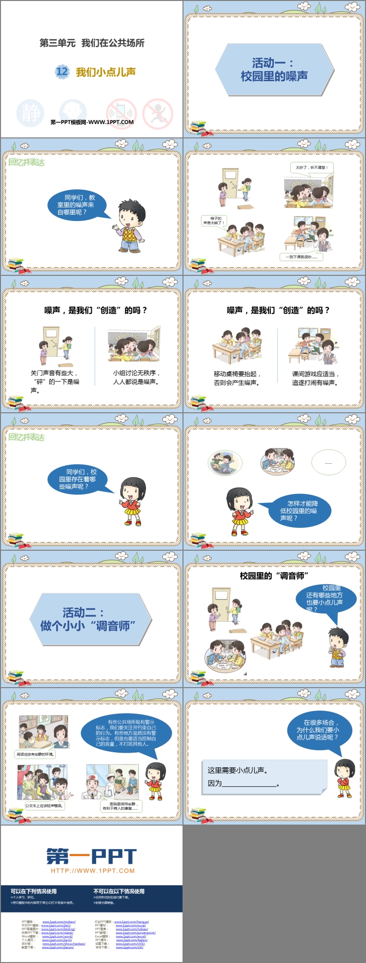 《我们小点儿声》PPT课件包含课堂活动、校园里的“调音师等内容。